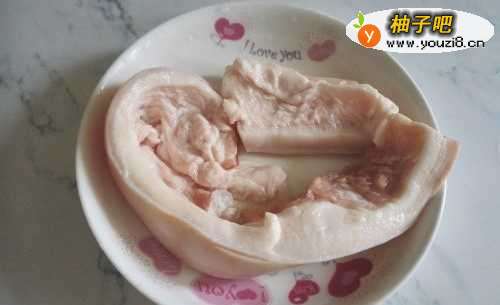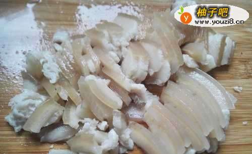 5把煮熟的肥肉捞出来,切片,控干水分之后再煎油。