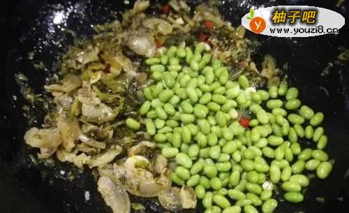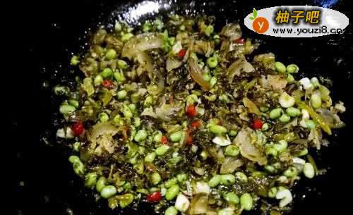 10雪菜炒几下之后,放入毛豆一起继续翻炒。