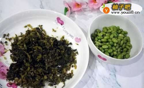 2准备好适量的毛豆和雪菜洗净备用。