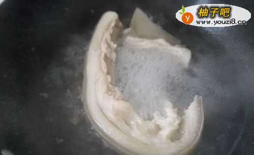4在锅里先放入凉水,再把肥肉放入进去,加入1勺料酒去腥,用大火煮至熟透。