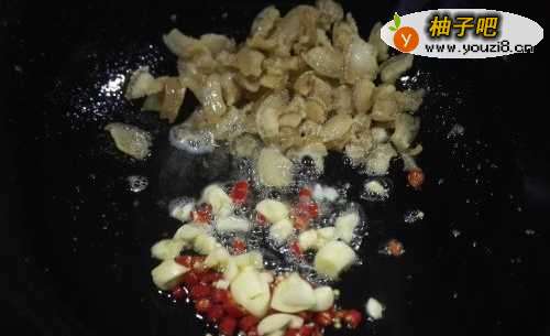 8肥肉煎出油后,将油倒出来装在碗里,留着下次炒菜时用。把红尖椒、蒜放入锅里用大火爆香。