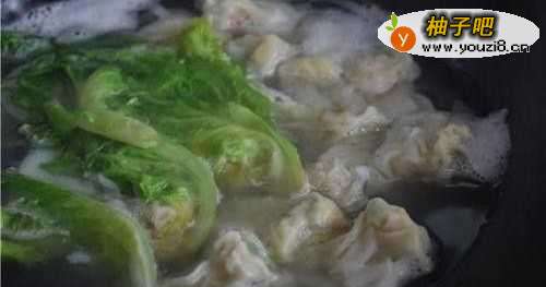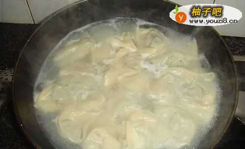 2水沸腾后,倒入云吞,直到云吞浮起来。