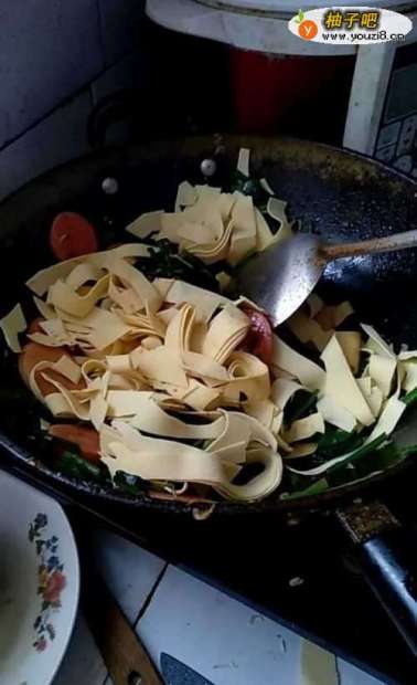 4锅烧热,锅内加油,葱花炒香,先加入肠炒,然后再加入干豆腐丝继续翻炒,加少许水,防止太干。