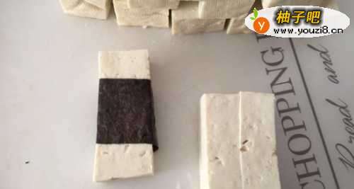 2然后用海苔卷把豆腐缠绕一圈,如图;