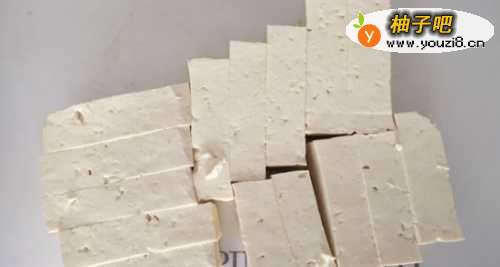 首先,我们将北豆腐切成长方形小条,如图;