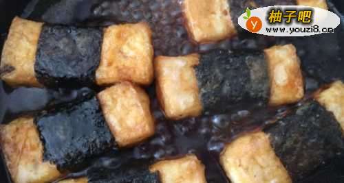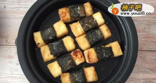 1、首先,我们将北豆腐切成长方形小条,如图;2、然后用海苔卷把豆腐缠绕一圈,如图;3、接下来,把豆腐裹上薄薄的一层淀粉;4、在碗中加入适量的生抽、蚝油、蜂蜜、清水,然后调匀;5、起锅烧油,放入豆腐,等到豆腐可以来回滑动的时候翻面,煎至四面金黄;6、最后,我们倒入碗汁,中小火至汤汁变得浓稠,就可以出锅了。