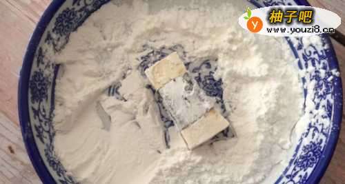 3接下来,把豆腐裹上薄薄的一层淀粉;