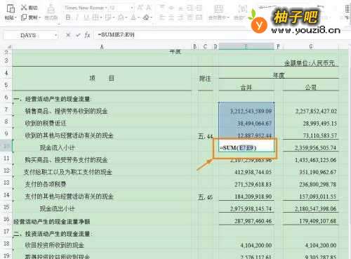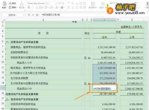 2选择单元格【E15】,输入公式【=SUM(E11:E14】计算流出。