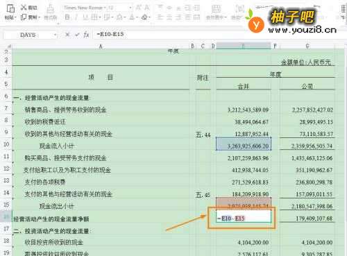 3选择单元格【E16】,输入公式【=E10-E15】计算经营性流即可。