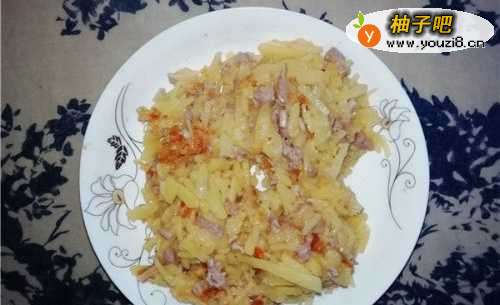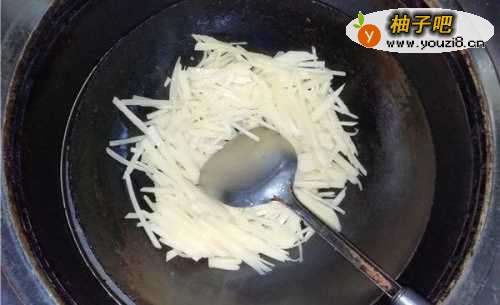 4倒入土豆丝和肉片翻炒