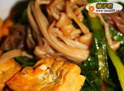 3.依次放入蘑菇,绿叶蔬菜,烫熟,最后加入冷面烧开就可以了