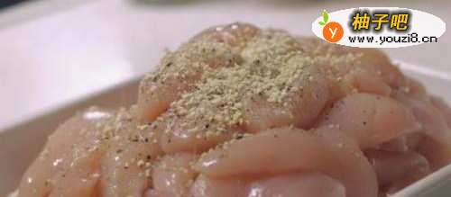3做法窍门二:把切好的鸡胸肉用料酒、胡椒粉、蚝油、盐搅拌均匀,腌制1个小时。