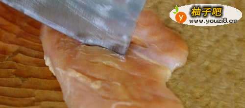 2做法窍门一:用刀将鸡胸肉斜着切五六刀,以便入味