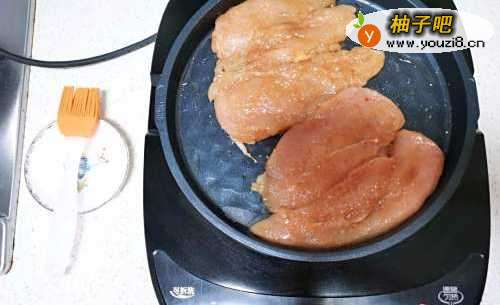 4电饼铛烧热后,倒入适量油,把腌制好的鸡胸肉放入电饼铛中