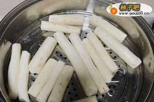 2山药去皮,上锅蒸20到30分钟左右。去皮时尽量戴一次性手套,不然会痒。