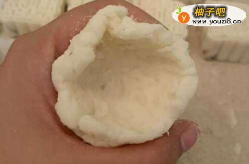 4包馅儿,取出一块山药泥,捏成碗状,里面加入一块红豆泥。