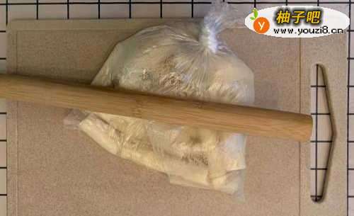 3取出山药,放入保鲜袋用擀面杖碾成泥,同时,糯米粉放入微波炉叮两分钟。将糯米粉和糖倒入山药泥里,揉面揉到不太粘手。
