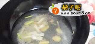 4锅底留一部分油,炒香备好的葱、姜、蒜、八角等,加入辅料(笋、香菇片,红辣椒等,根据自己选择的辅料来定),加入料酒、醋、老抽,沸腾一下,再加入适量的热水或者啤酒。