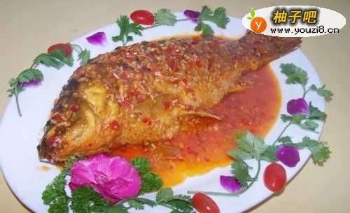 7将锅里的汤汁加水淀粉勾芡薄(如果没有准备淀粉就跳过),煮沸后浇在鱼身上,撒一些葱花或者香菜或者姜丝就可以了。如果不喜欢勾芡,就多吨一会儿汤,大火收汤,把汤收浓也可以。