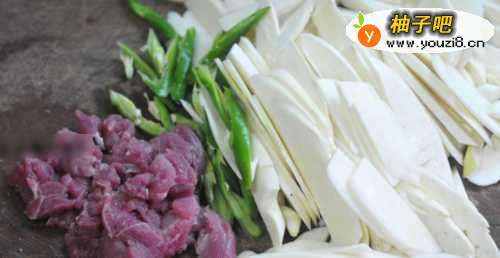2将猪肉、茭白和青椒切成薄片。
