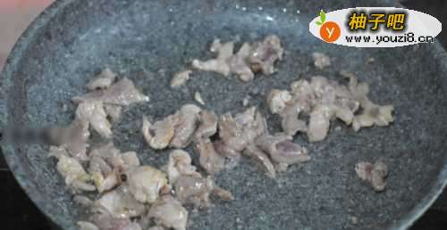 5将油倒入锅中加热,倒入肉,然后煎至颜色改变为止。