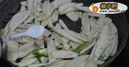 7炒至茭白水干为止,加盐调味。倒入少许生抽以增加香味,然后就可以把它捞出盛盘!