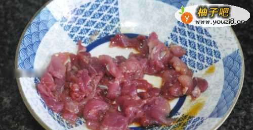 4将猪肉片放入碗中,加两汤匙生抽,拌匀并腌制十分钟。