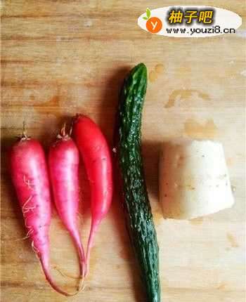 准备好制作该菜需要用到的材料:半个白萝卜 三个水萝卜 一根黄瓜 切丝器 去皮器