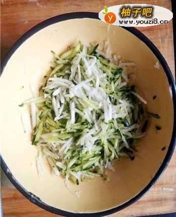 5将去皮后的萝卜和黄瓜放在切丝器上,并按照由上到下的节奏来进行切丝