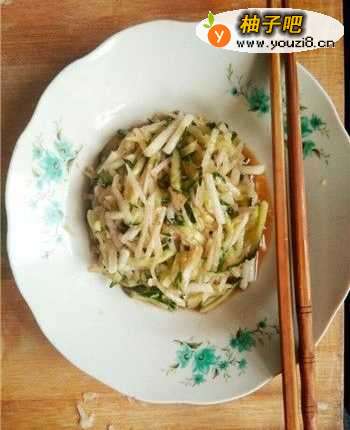 6依次放入两小勺食盐,两大勺食醋和几滴香油,并用筷子搅拌均匀,若可以吃辣的话,则可适当的放入些红辣椒,一来增加口感,二来可以使菜的整体色彩更加丰富。