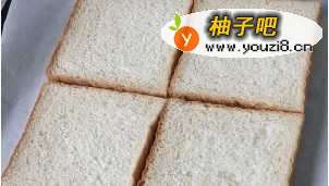2烤盘铺上油纸,摆上切片吐司备用。(自己做的吐司或者是买的都可以,尽量厚点。不要选质地疏松的吐司,芝士糊会渗进吐司,就出不了奶皮了)