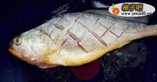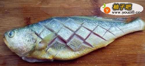 新鲜的大黄花鱼刮鳞川岔洗净,去内脏,表面切花刀,洒少许盐腌制片刻。