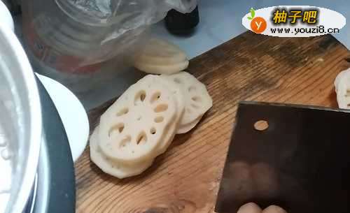 5同时将藕切成薄厚均匀的藕片,不要太厚,不然油炸的时候不容易熟