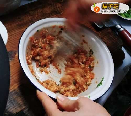 2搅均匀后,倒入料酒、香油、酱油、盐、五香粉、胡椒粉进行调味,再次用力搅拌(必须沿同一个方向进行搅拌),搅拌均匀后,放在冷藏室