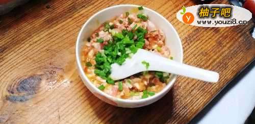 将葱、鸡蛋黄倒入肉末中进行搅拌,直接放入一个鸡蛋也是可以的