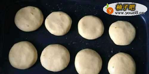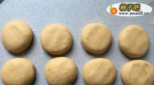4将柿子糯米团八等分,每个大约30克左右,先揉圆再按压成小饼。