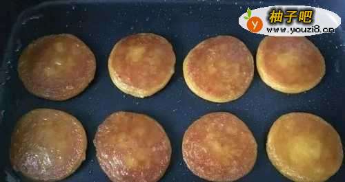 5平底锅加热刷上一层油。将柿子糯米小饼放入锅中,小火慢慢煎。