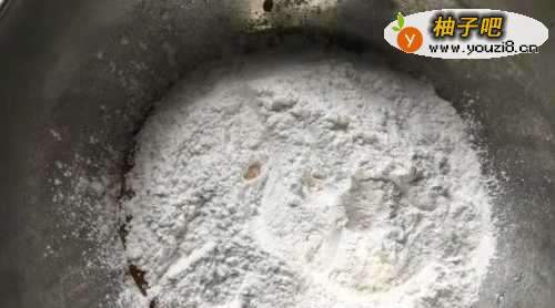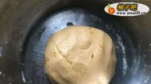 2将奶油柿子糊放入大盆中,放入一百克糯米粉。