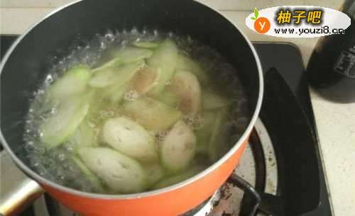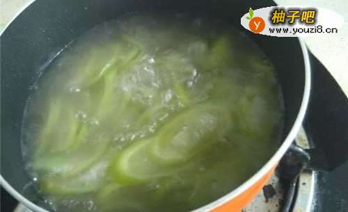 10将炒好的丝瓜片放入汤锅中。