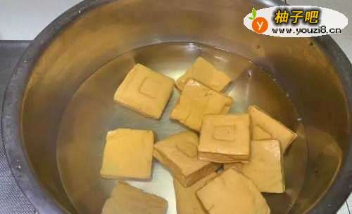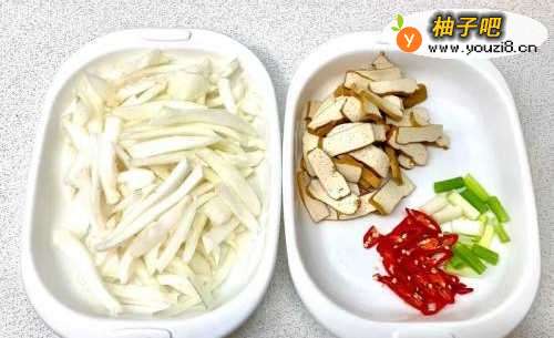 2香干用盐水煮过去除豆腥味后切片