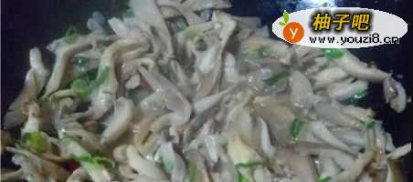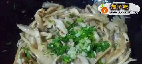 5倒入蘑菇,调入适量的盐、生抽和葱花,大火翻炒均匀。