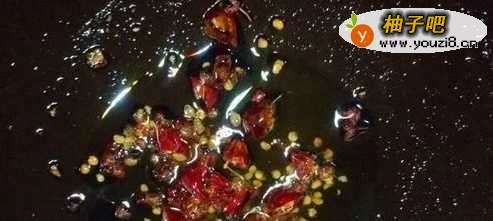 4锅中倒入适量的油,加入花椒粒和干红辣椒段煸出香味。