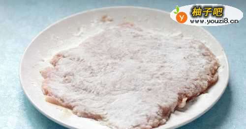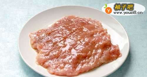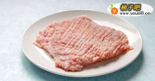 2猪肉里脊切成3厘米的肉片,切去肉上的筋膜,肉片用刀背敲薄。