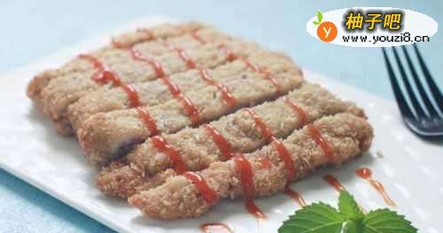 8炸好的猪排沥油,趁热切块,挤上适量番茄酱即可。