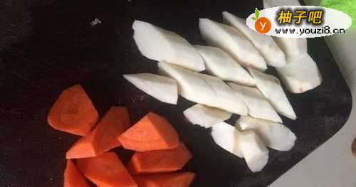 2将淮山和胡萝卜切成滚刀块,放盘备用。