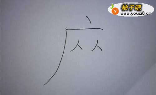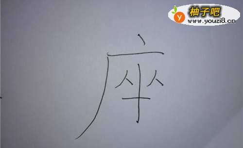4. 第3笔:写一个长撇,这样一人“广”字头便出来了。