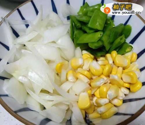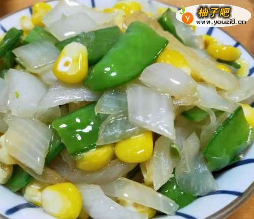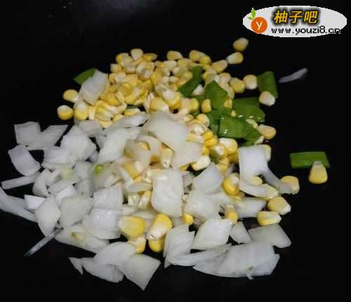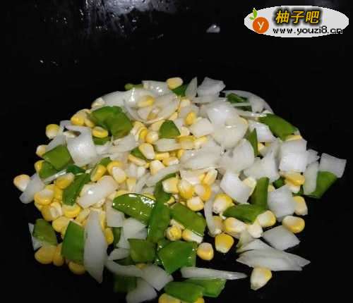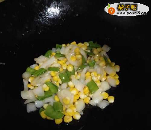 2锅中放入适量油再倒入玉米粒,白菜,荷兰豆下去