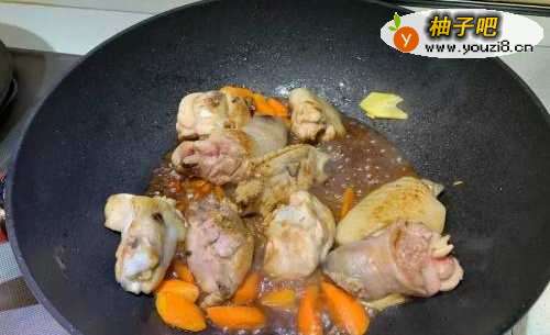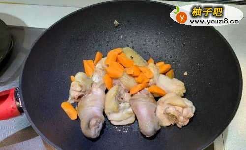 油热放入鸡肉,炒至鸡皮略呈焦色后放入红萝卜炒过