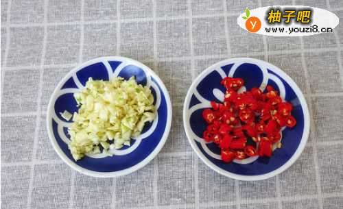 2把蒜瓣切成小颗粒状,辣椒切成成小段之后分别用碗装好。