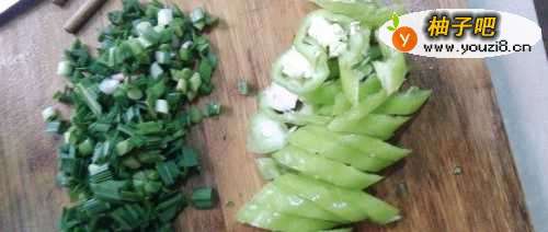 3蒜苗摘洗干净后切碎,尖椒洗干净斜切成块。